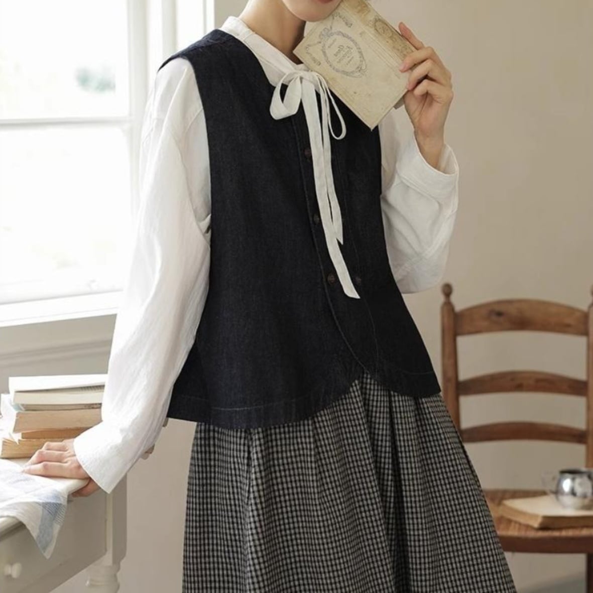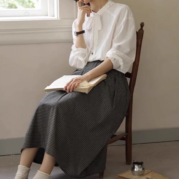 バンドカラーリボンタイブラウス