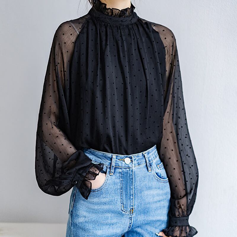 上品な高めのネックラインとパフスリーブが女性らしさを引き立て、普段使いからオフィススタイルまで幅広いシーンで活躍します。